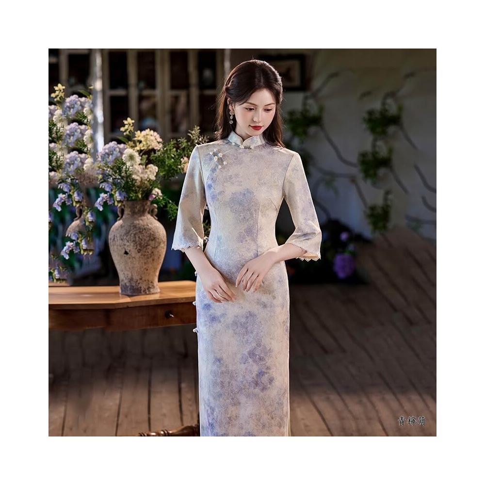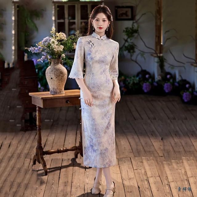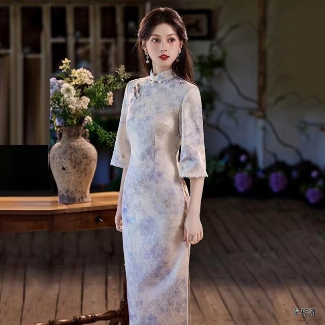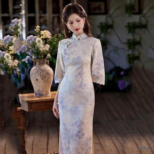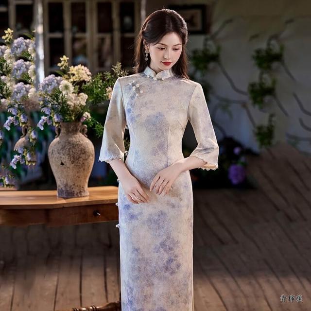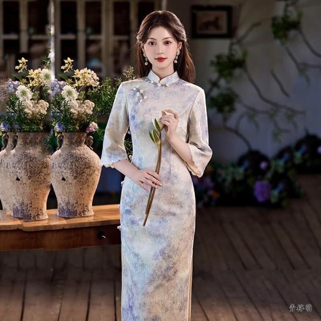 新中式改良旗袍 旗袍洋裝 中國風洋裝 溫柔風少女設計感連身裙表演服 溫婉高級感旗袍側八扣絕美秋冬日常鎏金銀珠緞複合旗袍