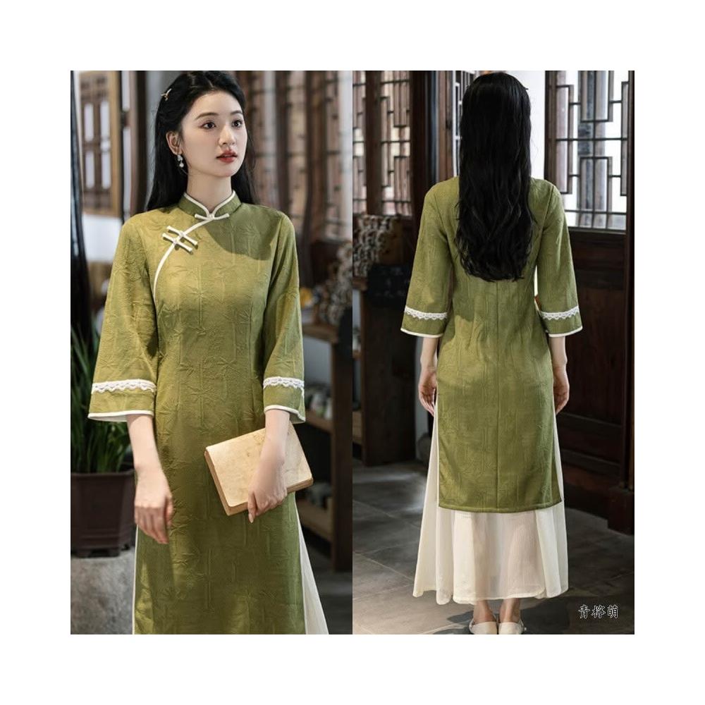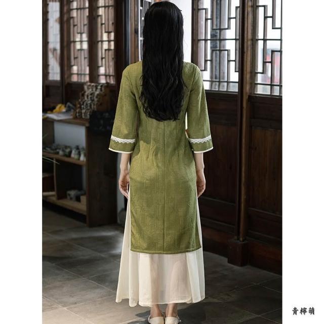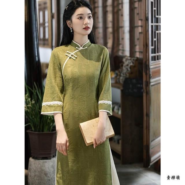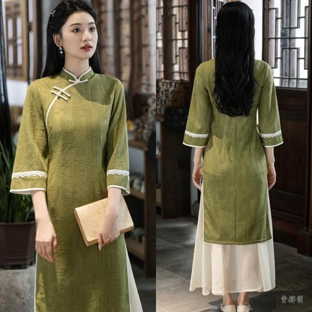 新中式改良旗袍 長袖旗袍 中國風洋裝 溫柔風少女設計感連身裙表演服 提花奧黛旗袍洋裝七分袖長款日常改良旗袍裙