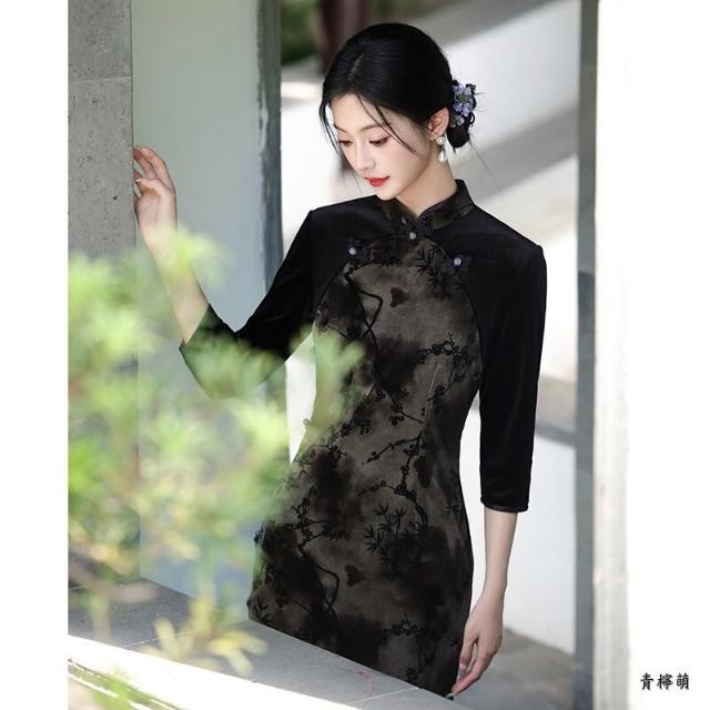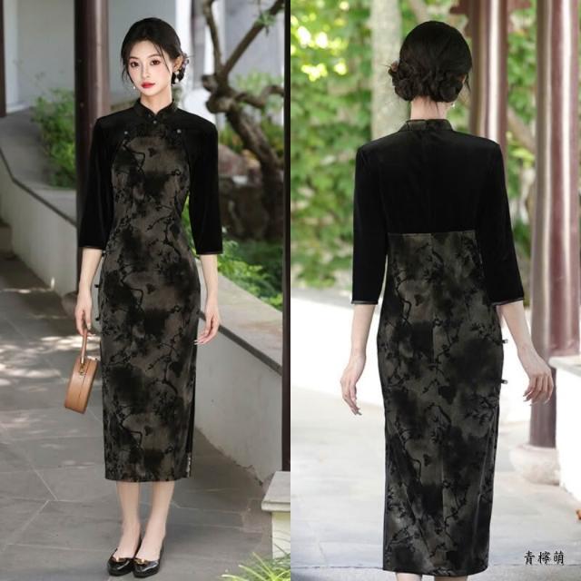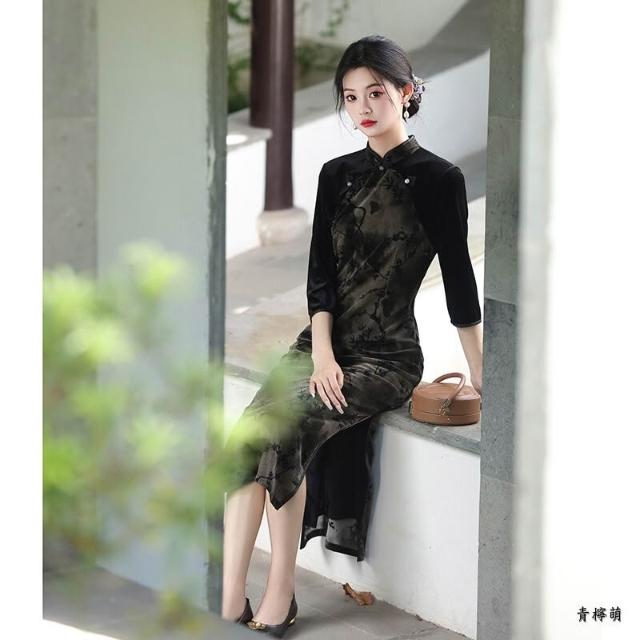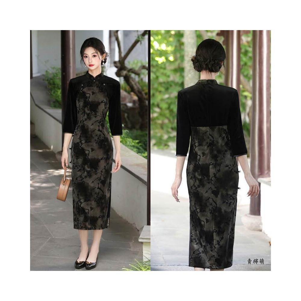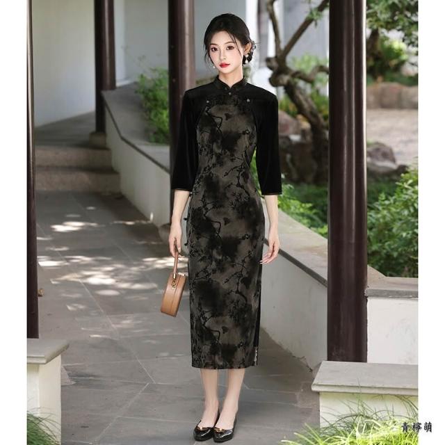 新中式改良旗袍 長袖旗袍 中國風洋裝 溫柔風少女設計感連身裙表演服 民國風新款氣質高端日常可穿素雅淑女洋裝