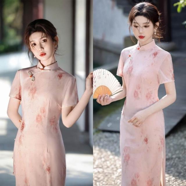 新中式改良旗袍 旗袍洋裝 中國風洋裝 溫柔風少女設計感連身裙表演服 網紗印花長版旗袍粉紅年輕款短袖修身顯瘦旗袍禮服