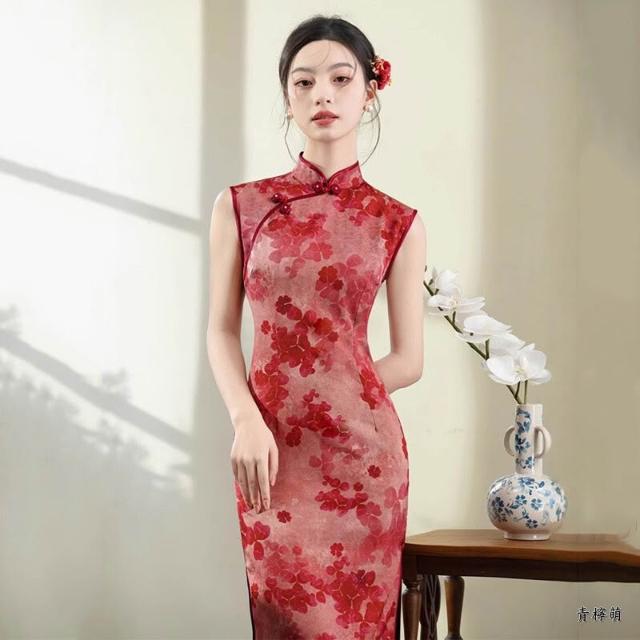 新中式改良旗袍 旗袍洋裝 中國風洋裝 溫柔風少女設計感連身裙表演服 紅色無袖國風新中式長旗袍改良年輕女高級感復古修身日常