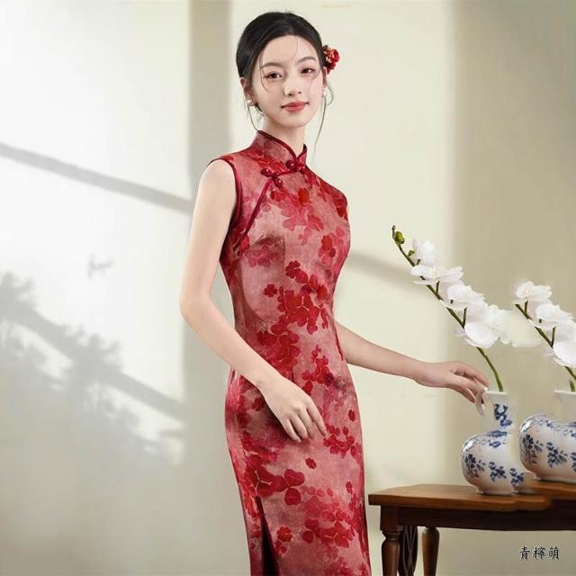 新中式改良旗袍 旗袍洋裝 中國風洋裝 溫柔風少女設計感連身裙表演服 紅色無袖國風新中式長旗袍改良年輕女高級感復古修身日常