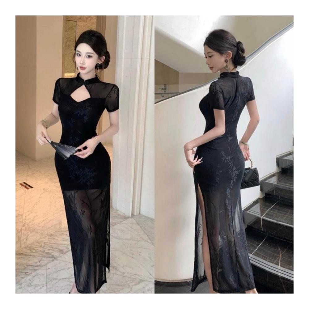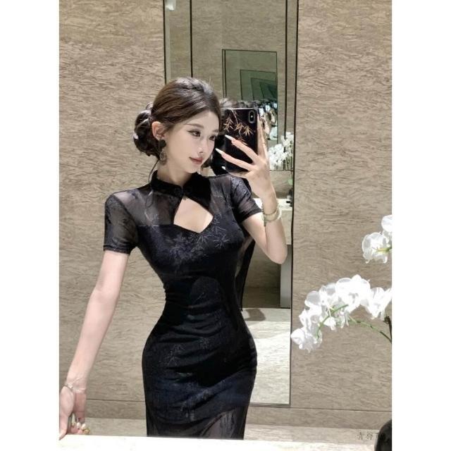 新中式改良旗袍 旗袍洋裝 中國風洋裝 少女設計感連身裙表演服 復古性感網紗鏤空立領改良日常旗袍裙國風氣質側開叉修身洋裝