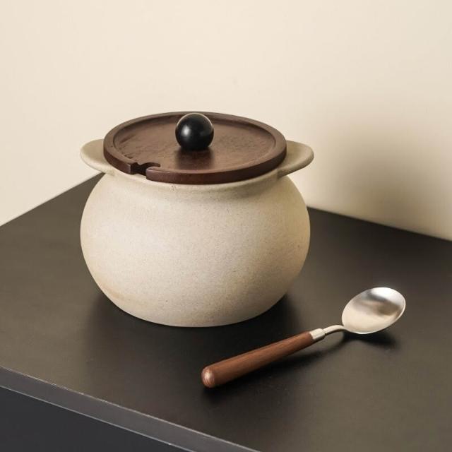 新款粗陶豬油罐耐高溫雙耳陶瓷豬油罐價優油潑辣子罐帶蓋勺調料罐置物架收納架居家收納桌面收納陳列架儲物架居家生活好物