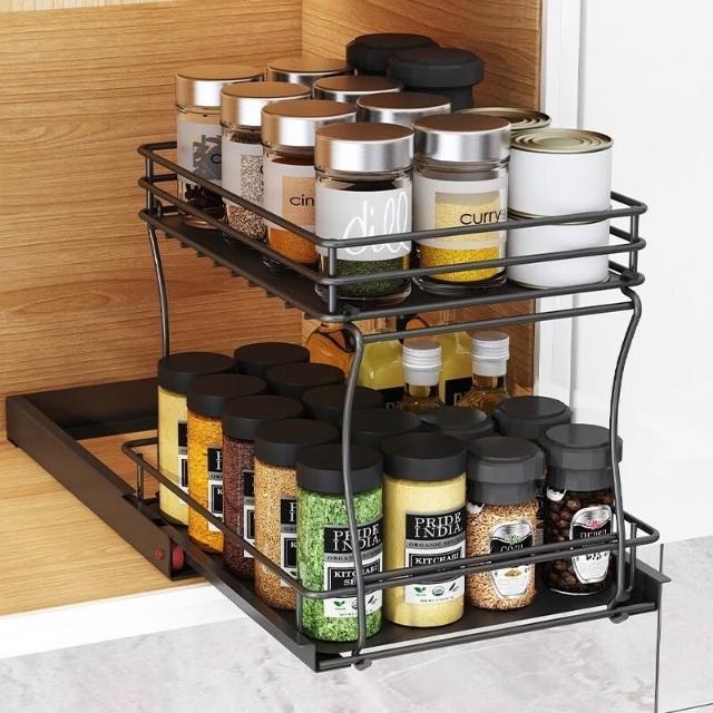 廚柜雙層推拉調料籃廚房櫥柜臺面香料架調味瓶收納整理架居家生活用品廚房收納浴室收納居家收納置物架收納架儲物架