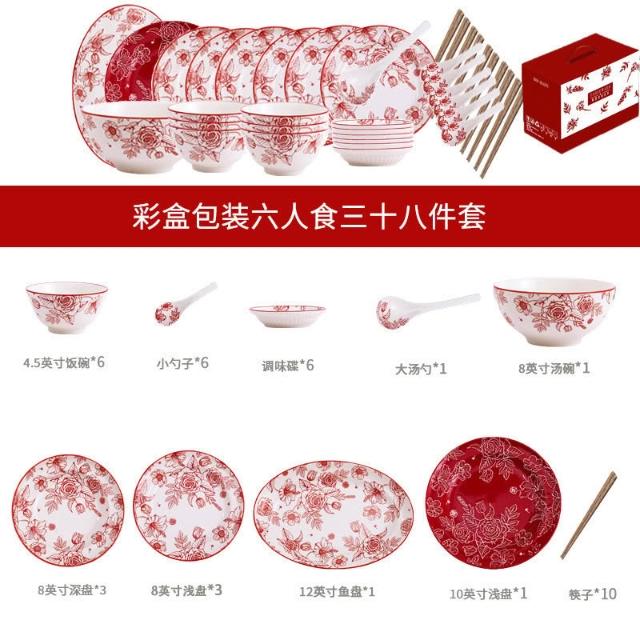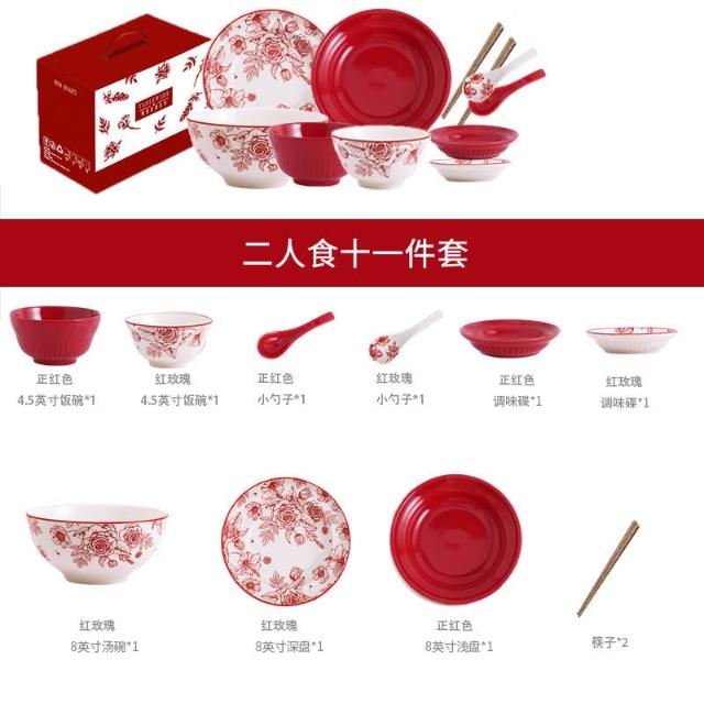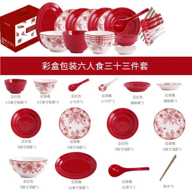 喜慶紅玫瑰碗碟套裝陶瓷碗湯碗家用碗盤紅色禮盒餐具盤子碗具餐桌托盤置物盤收納盤簡約風甜品盤水果盤菜盤牛排盤點心碟餐具