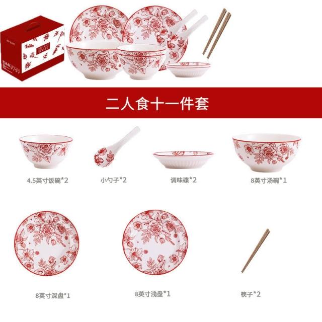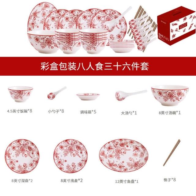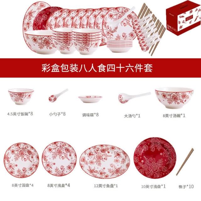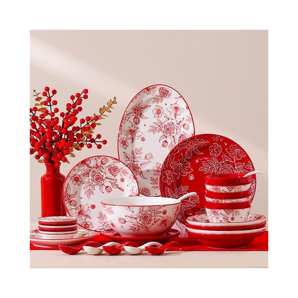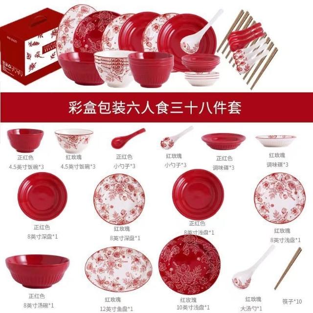 喜慶紅玫瑰碗碟套裝陶瓷碗湯碗家用碗盤紅色禮盒餐具盤子碗具餐桌托盤置物盤收納盤簡約風甜品盤水果盤菜盤牛排盤點心碟餐具