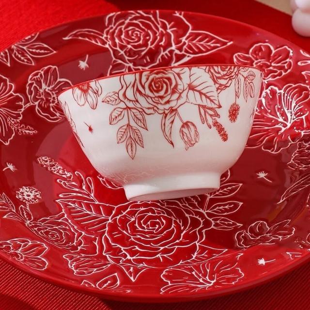 喜慶紅玫瑰碗碟套裝陶瓷碗湯碗家用碗盤紅色禮盒餐具盤子碗具餐桌托盤置物盤收納盤簡約風甜品盤水果盤菜盤牛排盤點心碟餐具