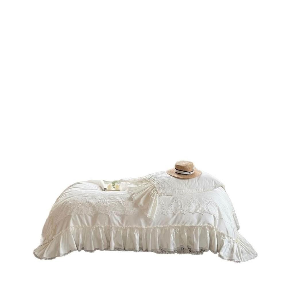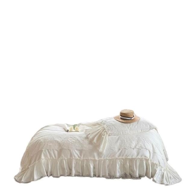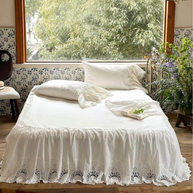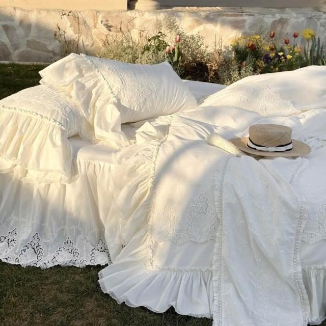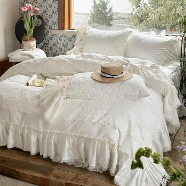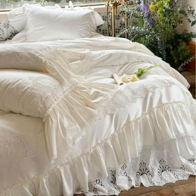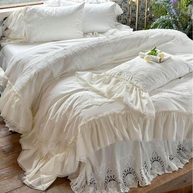 法式荷葉花邊重工蕾絲刺繡床裙款四件套全棉貢緞長絨棉被套床品