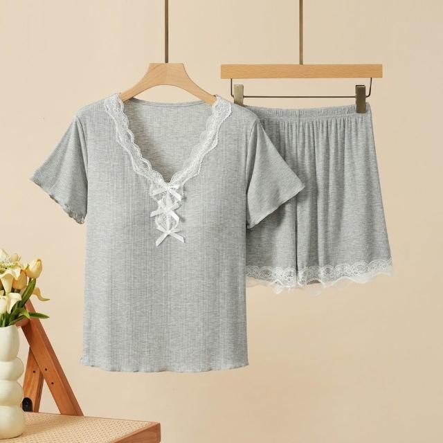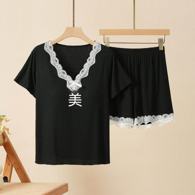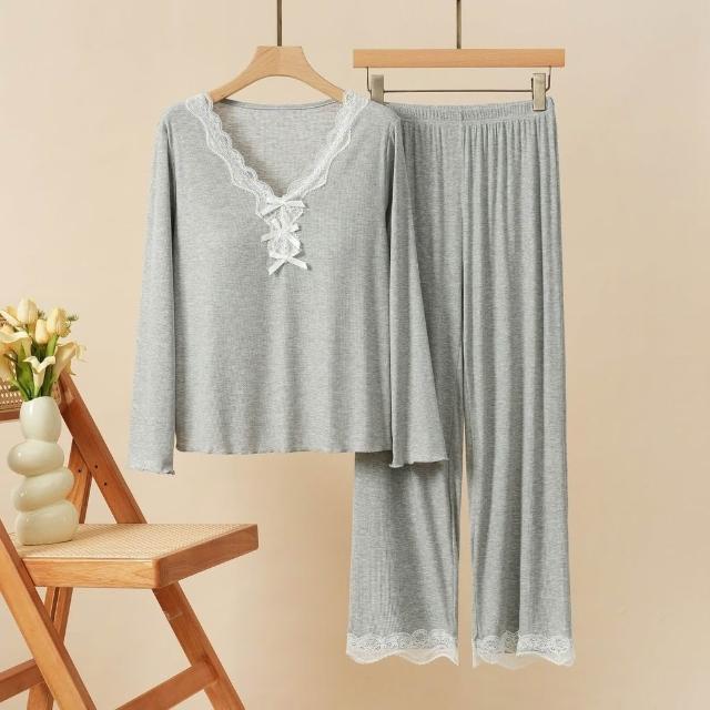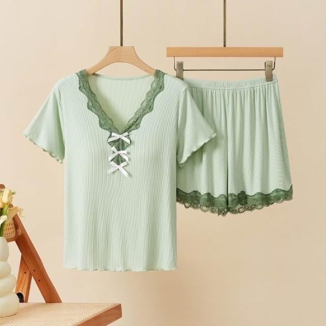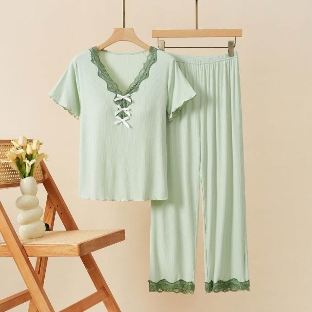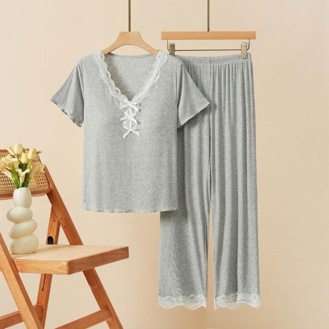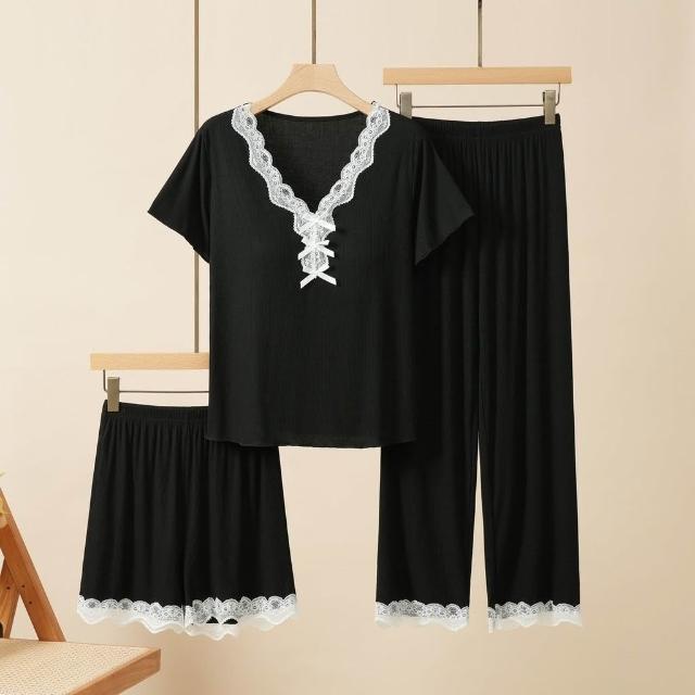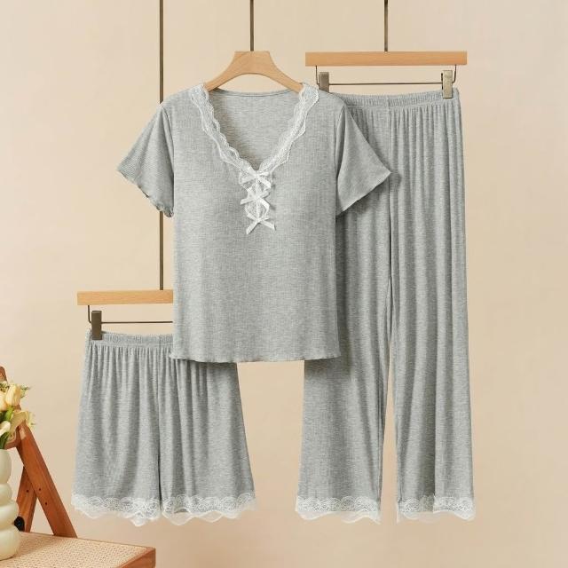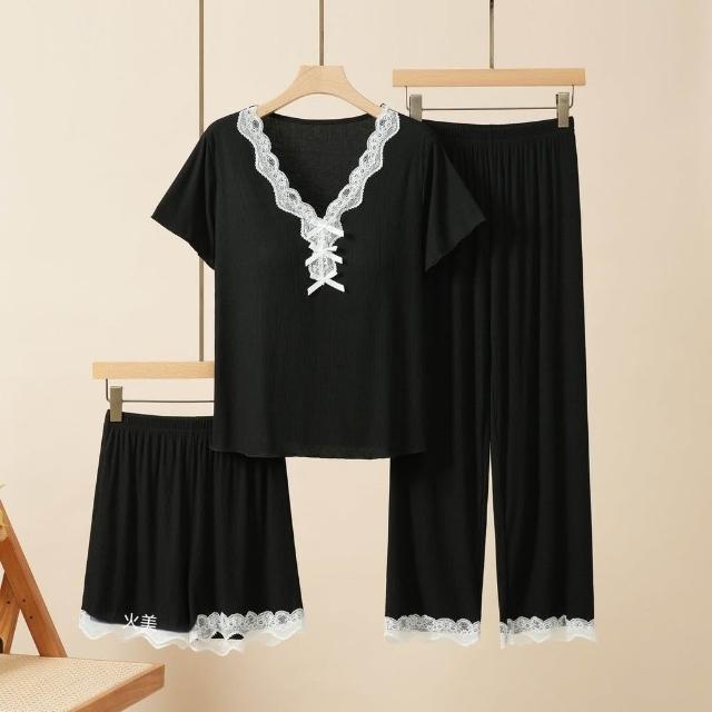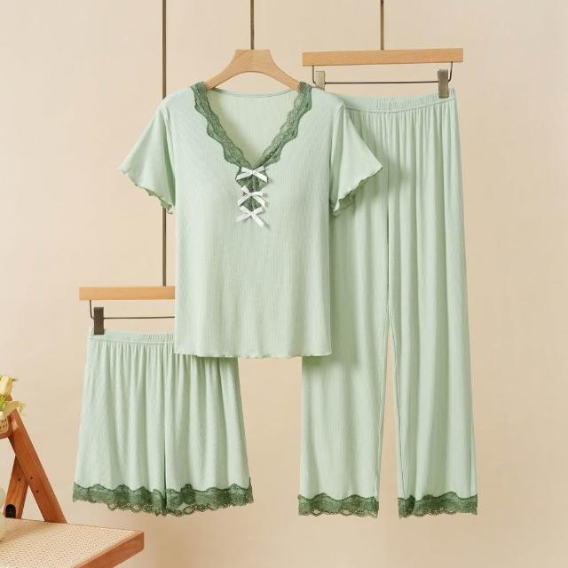 可嘉優選莫代爾帶胸墊蕾絲花邊睡衣女短袖長褲三件套裝春夏秋外穿家居服