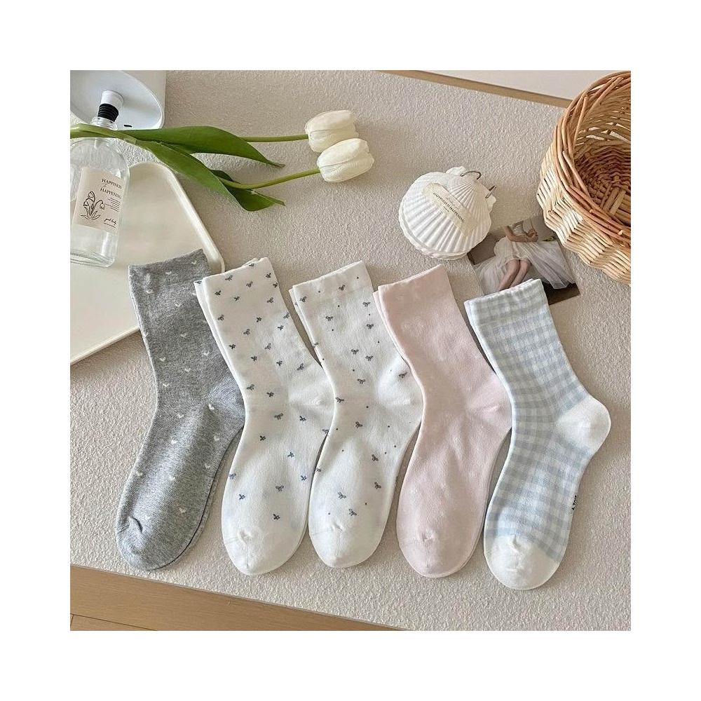 可嘉優選無骨藍格子蝴蝶結中筒襪子女春夏季甜美日系少女風堆堆襪百搭棉襪