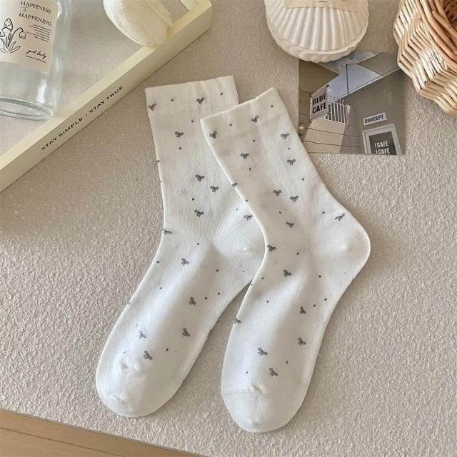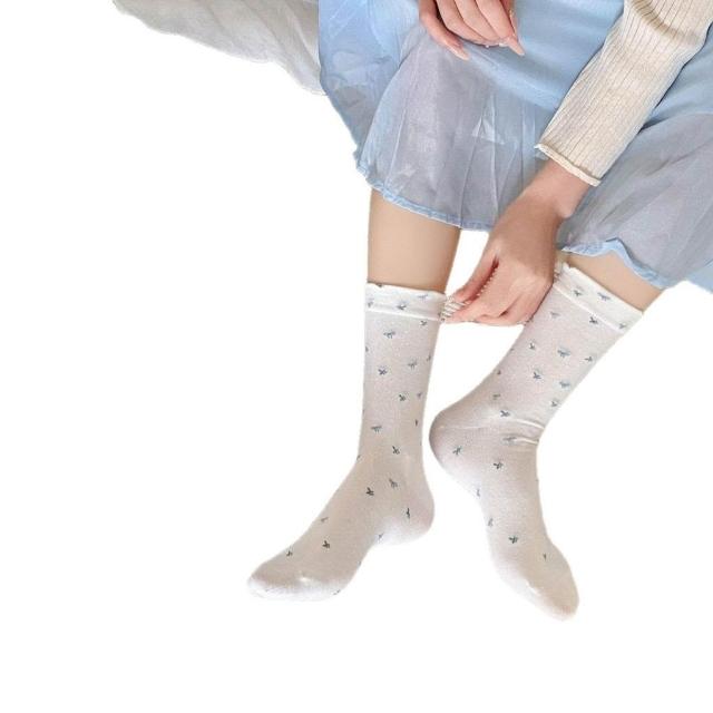 可嘉優選無骨藍格子蝴蝶結中筒襪子女春夏季甜美日系少女風堆堆襪百搭棉襪