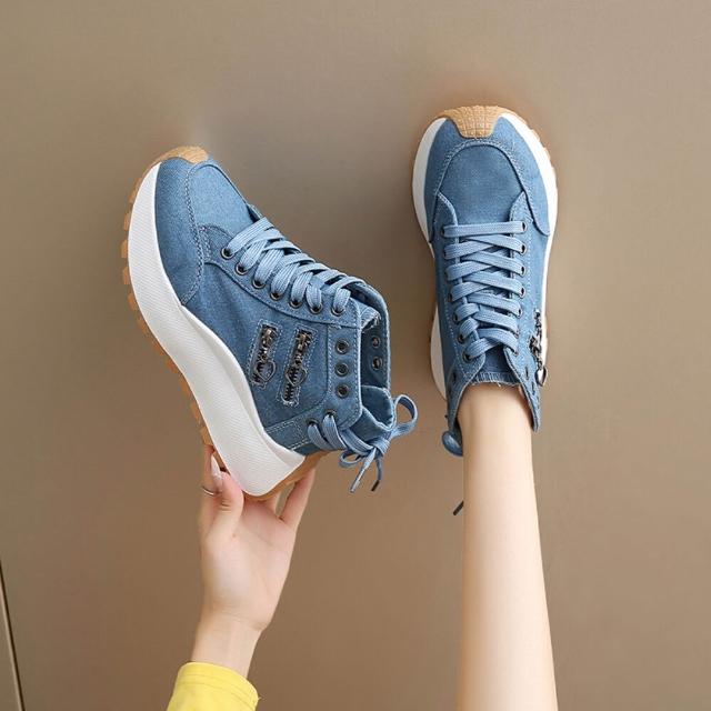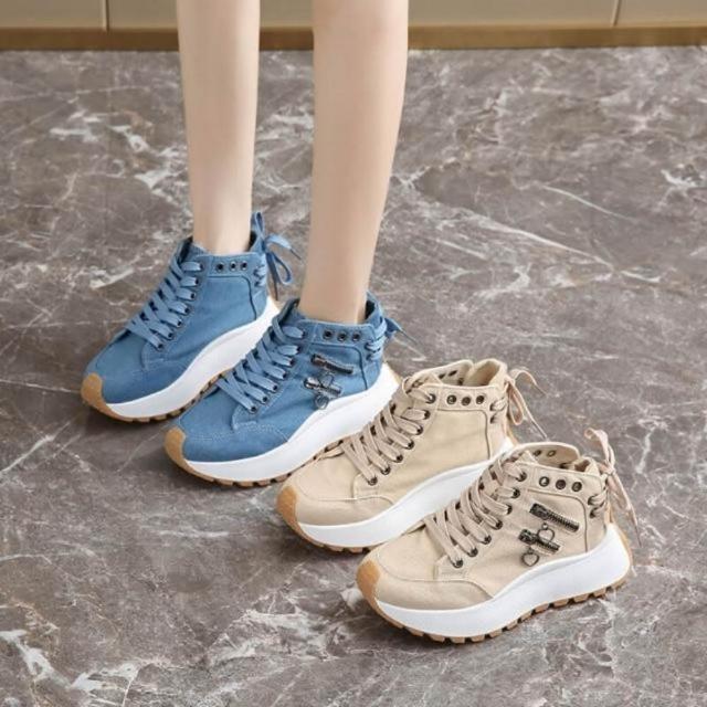 帆布鞋女厚底新款高幫高筒鞋春夏季透氣增高簡約風休閑鞋耐磨防滑馬丁靴圓頭運動鞋不磨腳厚底鞋鬆糕底百搭舒適柔軟板鞋牛仔黑女鞋