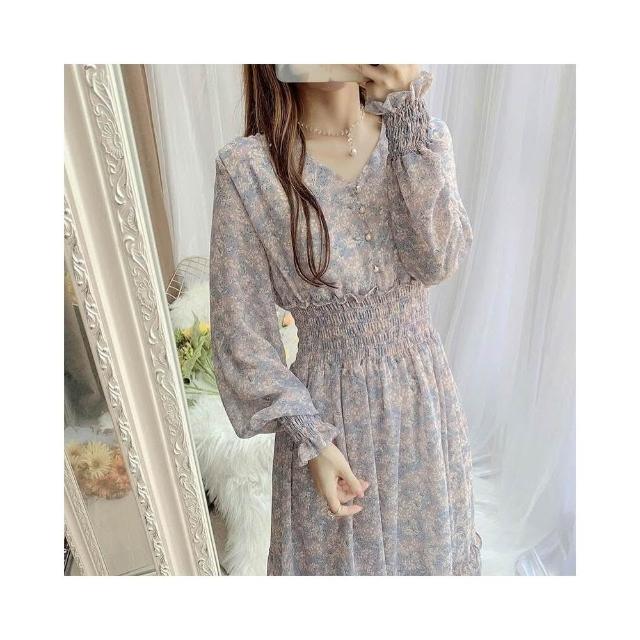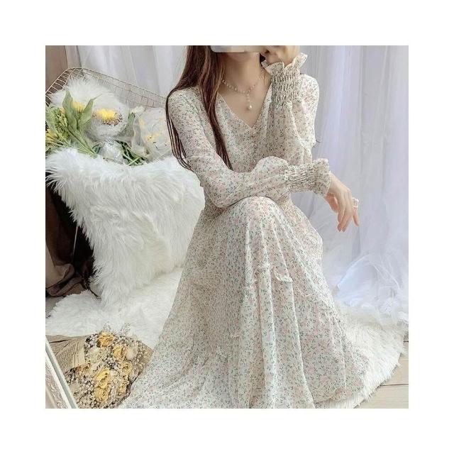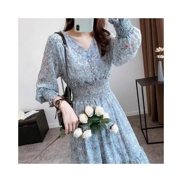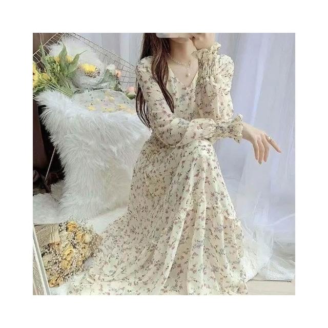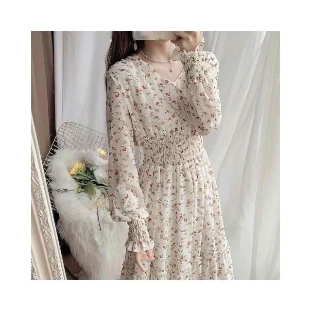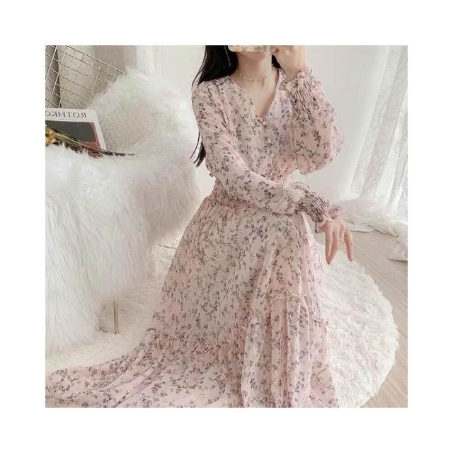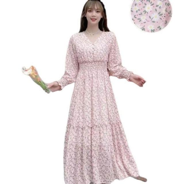 洋裝女2025春夏秋季多款洋裝碎花長袖連衣裙女雪紡印花荷葉邊大擺長裙潮流連身裙印花休閒收腰韓版媽媽中長裙