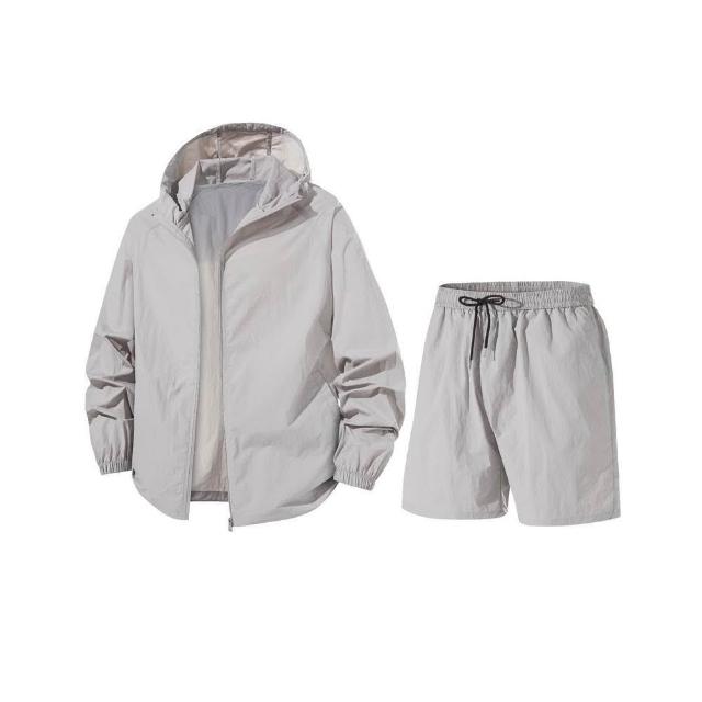 運動套裝女男冰絲防曬外套輕薄透氣情侶套裝工裝短褲夏天百搭寬鬆休閒套裝吸濕排汗連帽外套五分褲戶外登山釣魚運動短褲防曬套裝男
