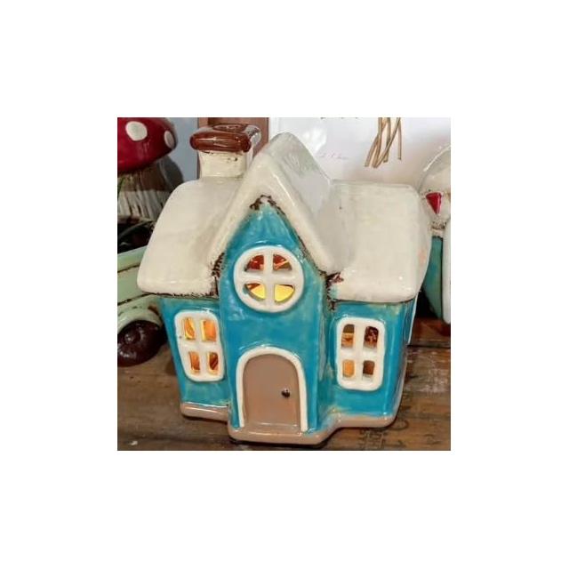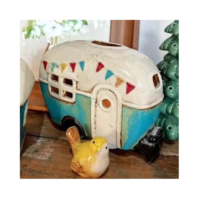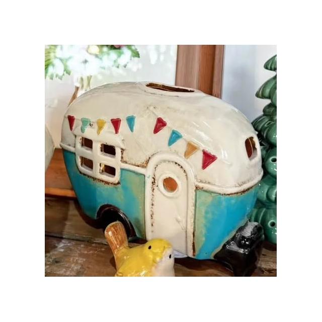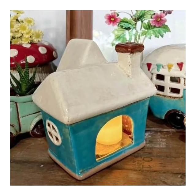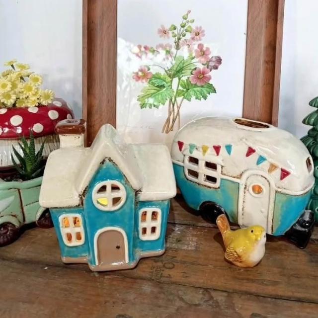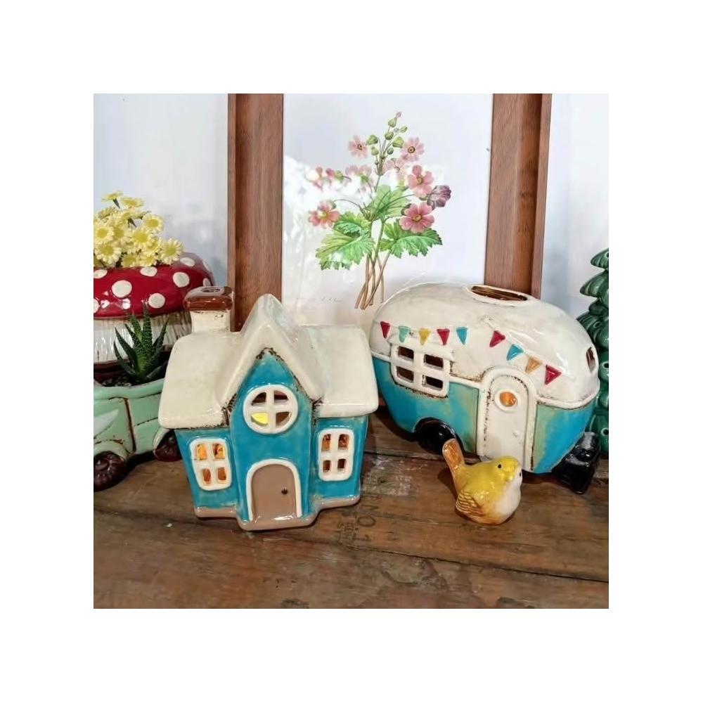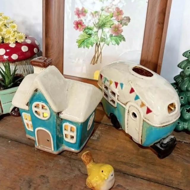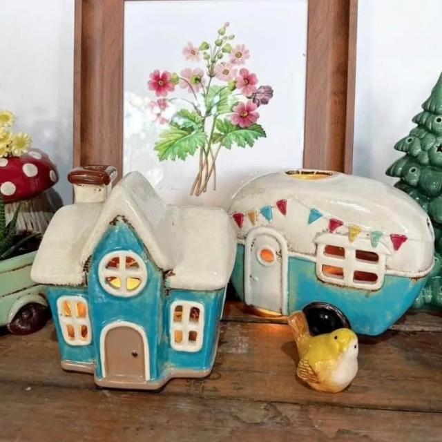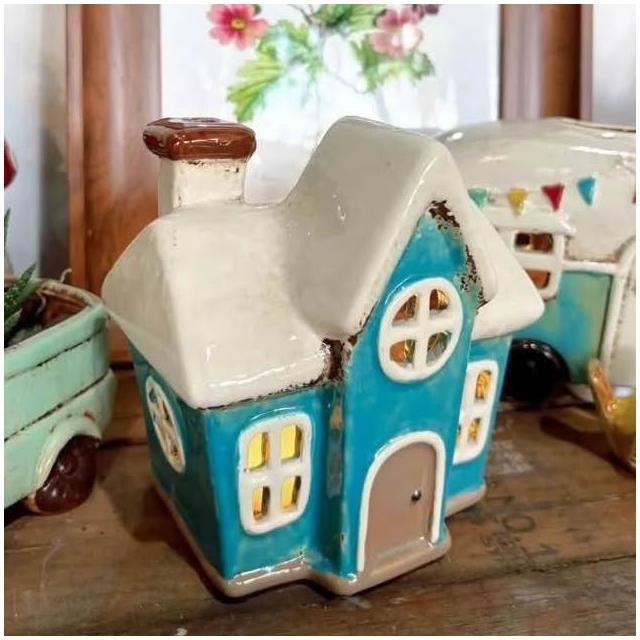 繪木屋家飾藍色系雪白小屋/三角旗露營車 丹麥燭台小屋 陶瓷房屋 高溫陶瓷 園藝擺飾 陶瓷擺飾 居家佈置 蠟燭座