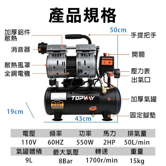 TOPWAY無油式空壓機 9L 24L 贈風槍 風管 快速型 雙缸式110V/60Hz 雙進氣 壓縮機