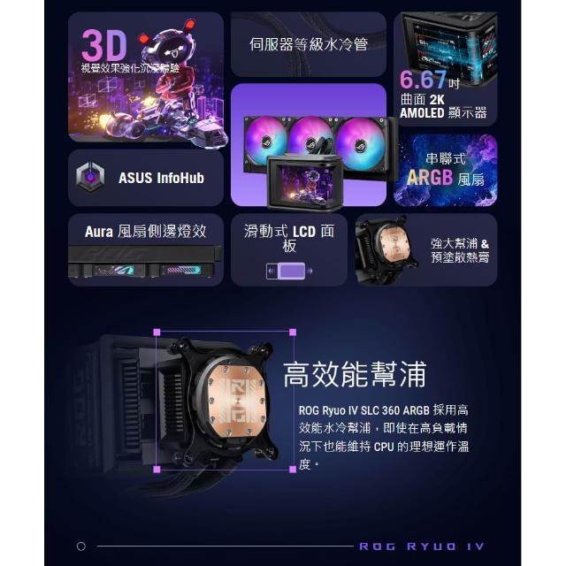 ASUS 華碩ROG RYUO IV SLC 360 ARGB 龍王四代 6.67吋曲面螢幕 磁吸式風扇 低噪音 CPU散熱器 水冷