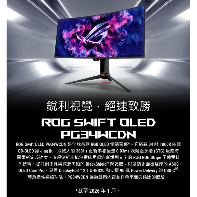 ASUS 華碩ROG Swift OLED PG34WCDN 曲面電競螢幕 34吋 360Hz 2K 0.03ms 電腦螢幕 曲面螢幕