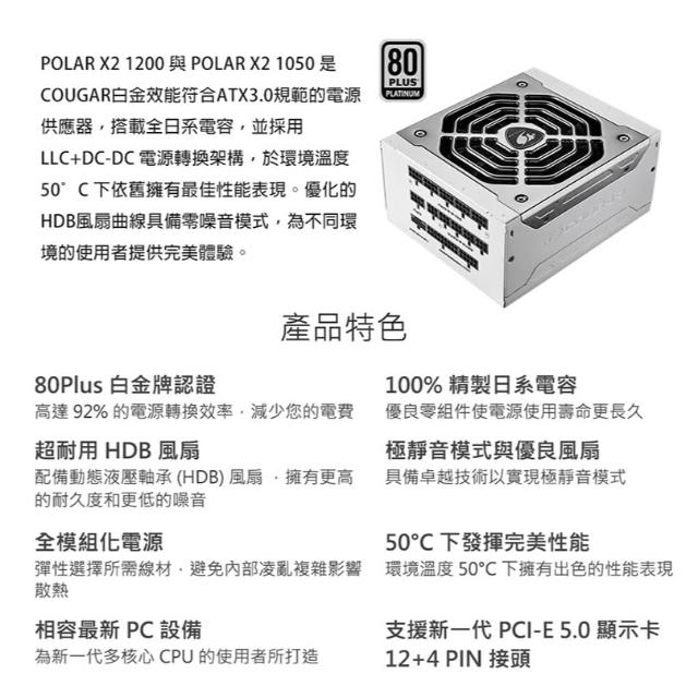 COUGAR 美洲獅Cougar 美洲獅 POLAR X2 1050W 1200W 80Plus 白金牌認證 電源供應器 全模組ATX3.0