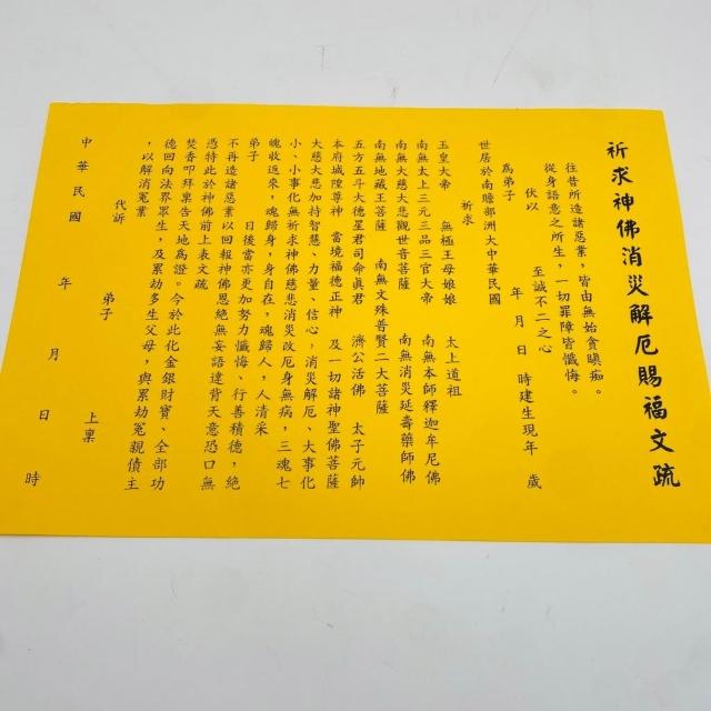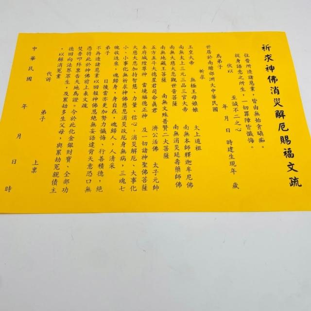 古德金香祈求神佛消災解厄賜福文疏。疏文、文疏 /祈求消除災難、解除困厄以及賜予福氣 中元普渡