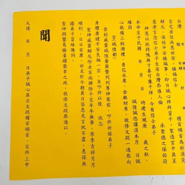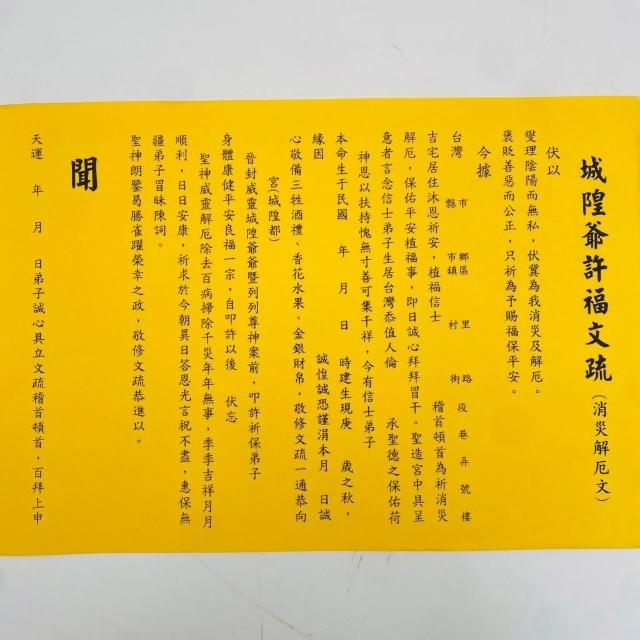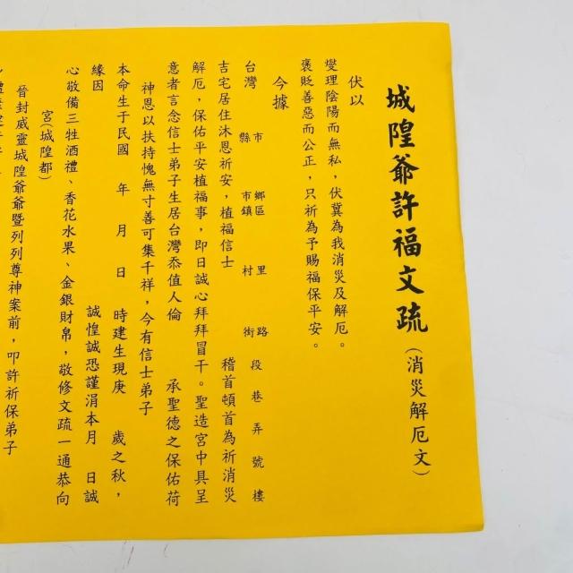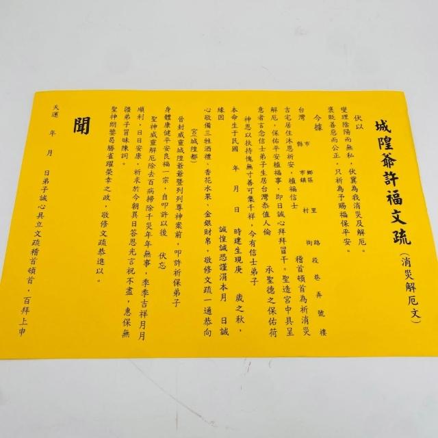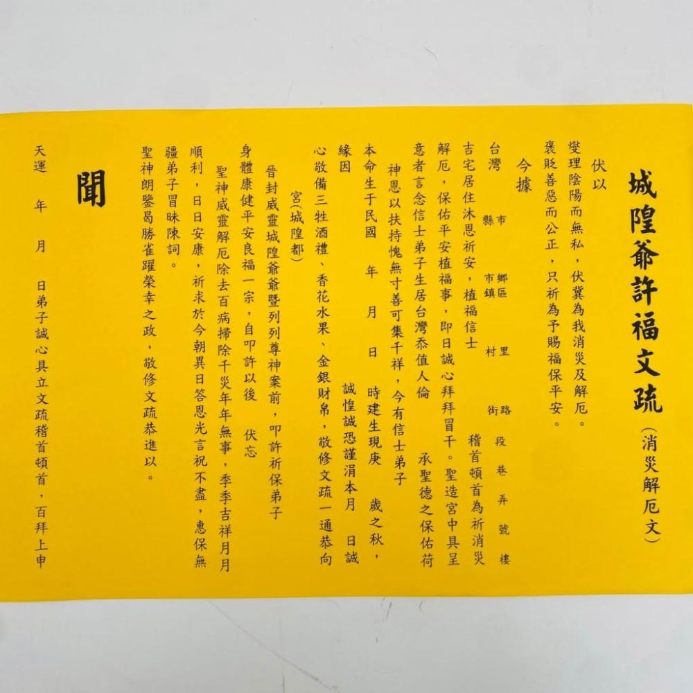 古德金香城隍爺許福文疏 (消災解厄文)。疏文、文疏 /城隍爺祈求庇佑、消災解厄 中元普渡