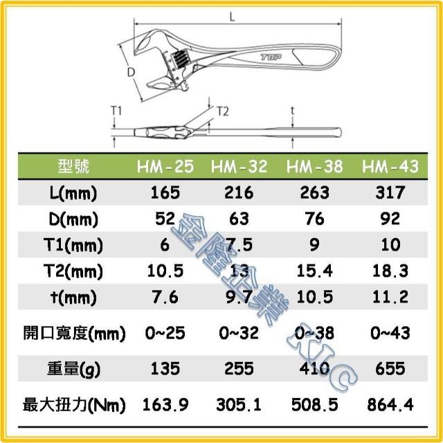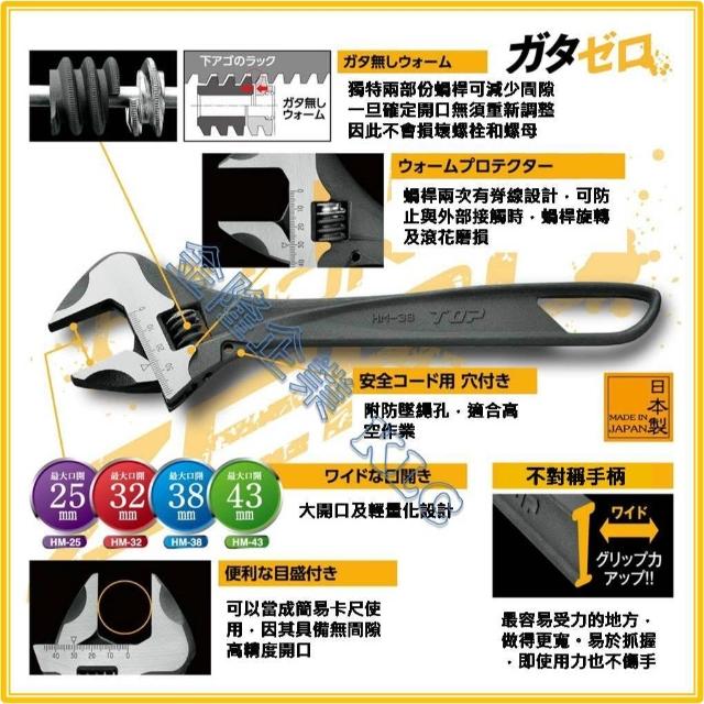 天隆五金 日本 TOP ZERO 零間隙 大開口活動扳手 HM-25 HM-32 HM-38 HM-43