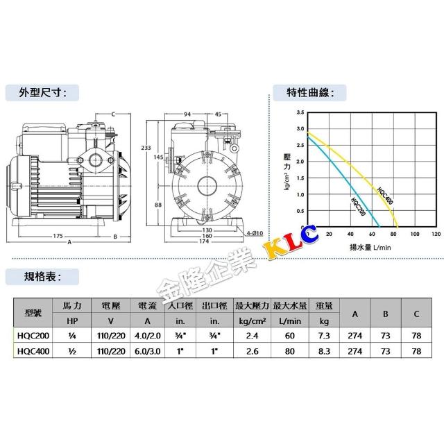 天隆五金 大井 HQC200B 1/4HPx3/4 頂樓順水加壓機 加壓馬達 管內不儲壓 白鐵葉輪