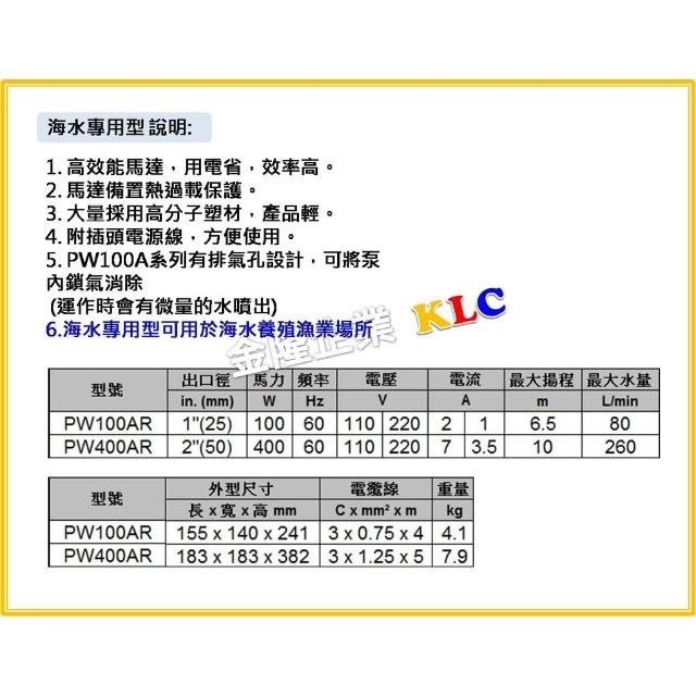 天隆五金 大井 PW100AR 出口1吋 海水專用沉水泵浦 海水養殖泵浦 水龜 沉水幫浦 馬達