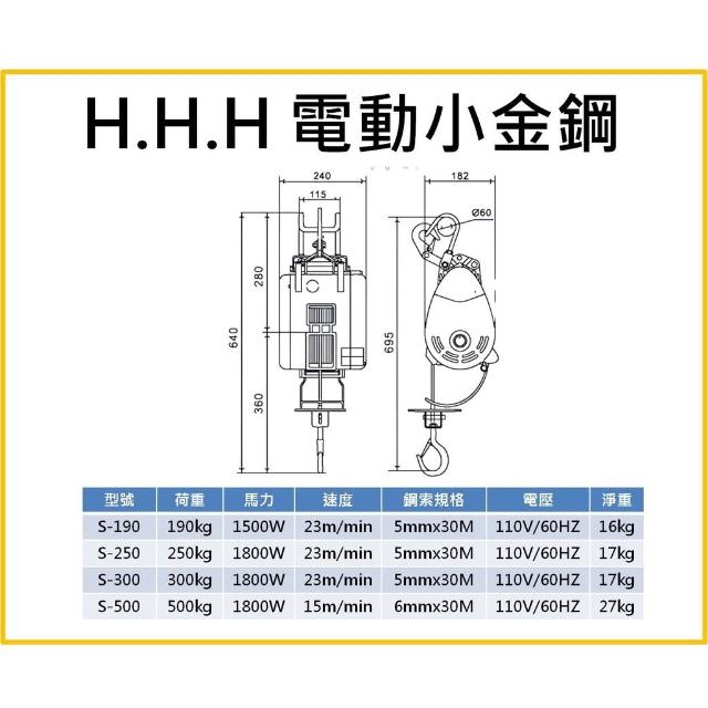 天隆五金 3H牌 190 250 300 500 公斤小金鋼吊車 電動吊車 有線搖控 小金剛吊車