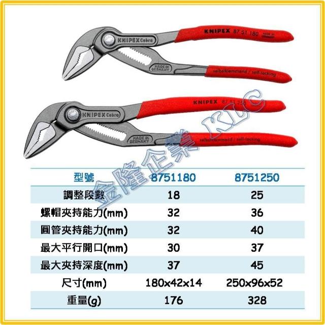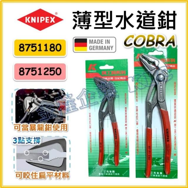 德國製 KNIPEX COBRA 超薄型快速水管鉗 薄型水道鉗 87 51 250 87 51 180