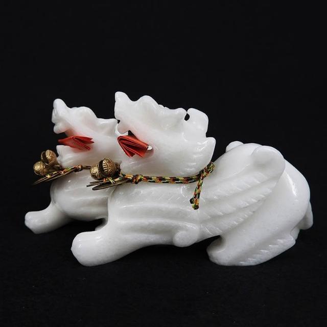 吉祥開運坊招財貔貅招財陣【白玉石貔貅 白玉石飛天貔貅中型 附五帝錢 銅鈴】開光