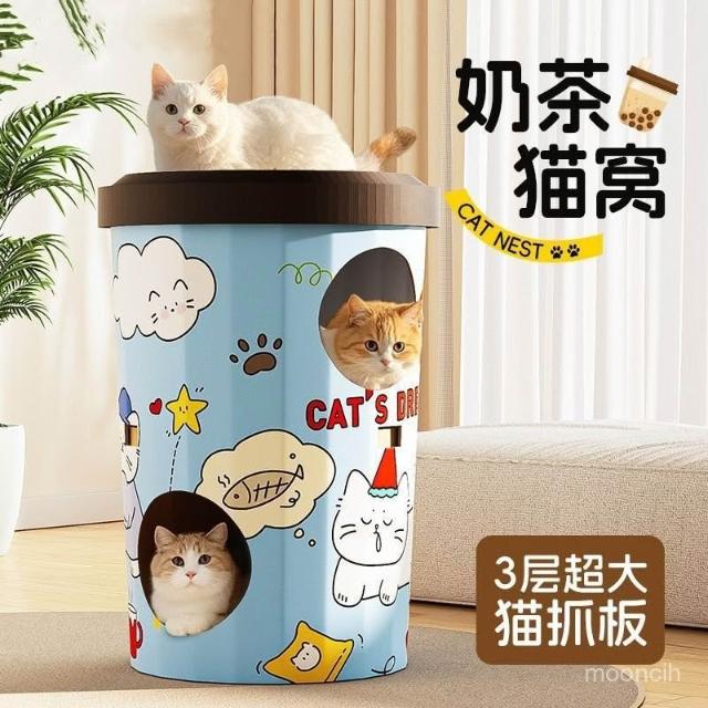 小T嚴選貓抓闆奶茶桶貓窩三層貓別墅厚瓦楞紙奶茶杯子貓房寵物貓咪躲避屋