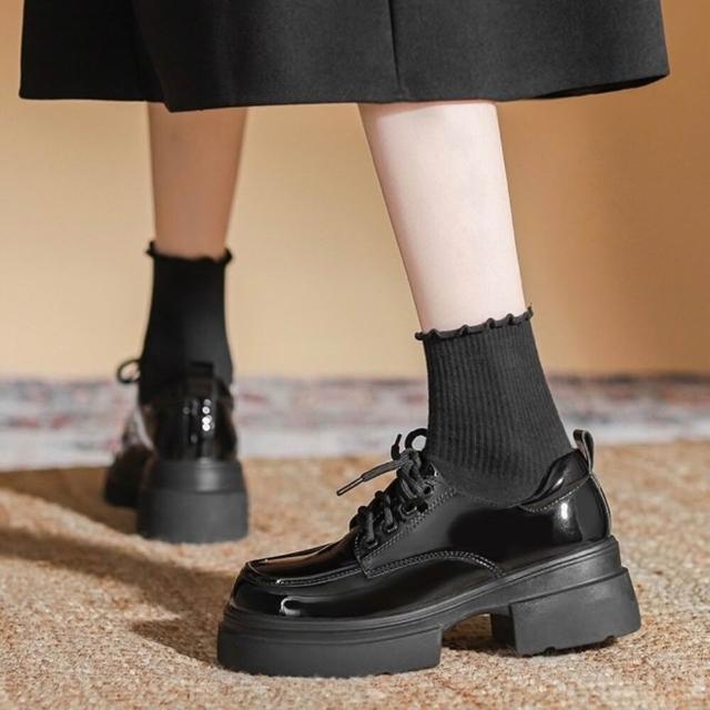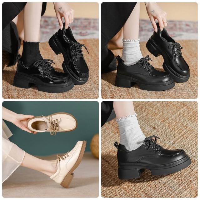 厚底鞋 黑色 鞋帶學院風 全黑皮面 霧皮米駝色 亮皮 高台 5.5公分 休閒鞋 福樂鞋