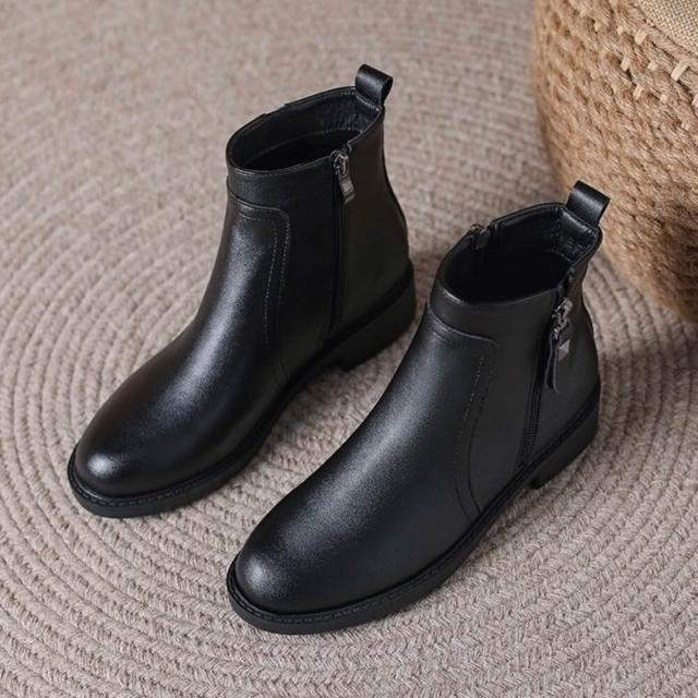 皮面短靴 踝靴 拉鍊穿脫 黑色靴子 防水 女靴