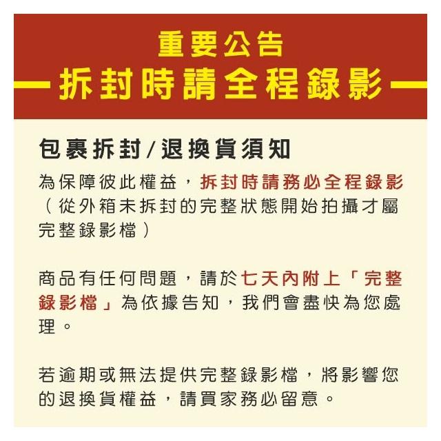 - 為保障您購物權益,開箱過程請全程錄影;如有問題請使用APP透過「問問」與商店聯繫,祝您購物愉快。