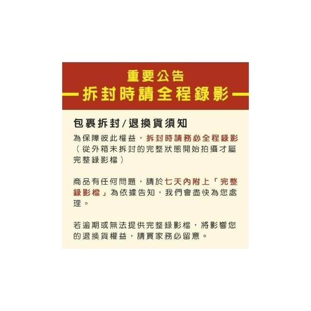 - 為保障您購物權益,開箱過程請全程錄影;如有問題請使用APP透過「問問」與商店聯繫,祝您購物愉快。
