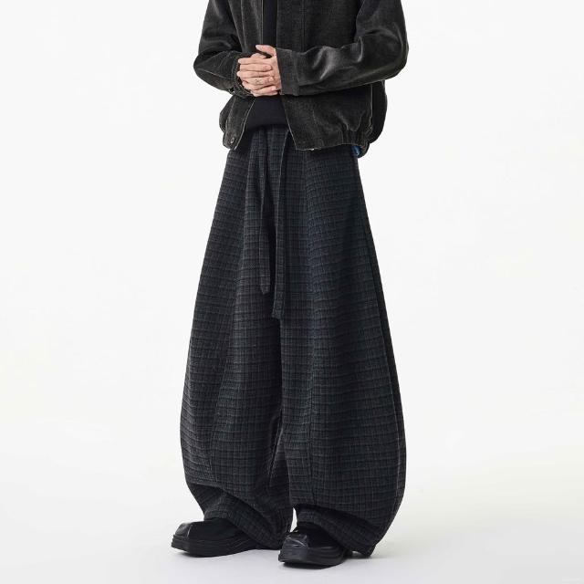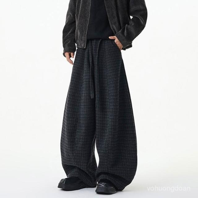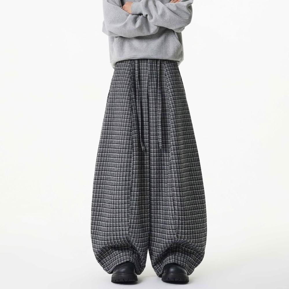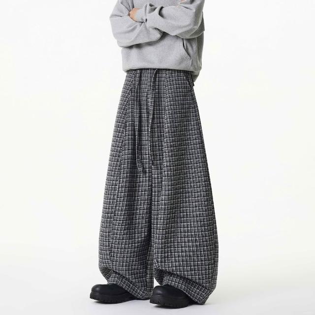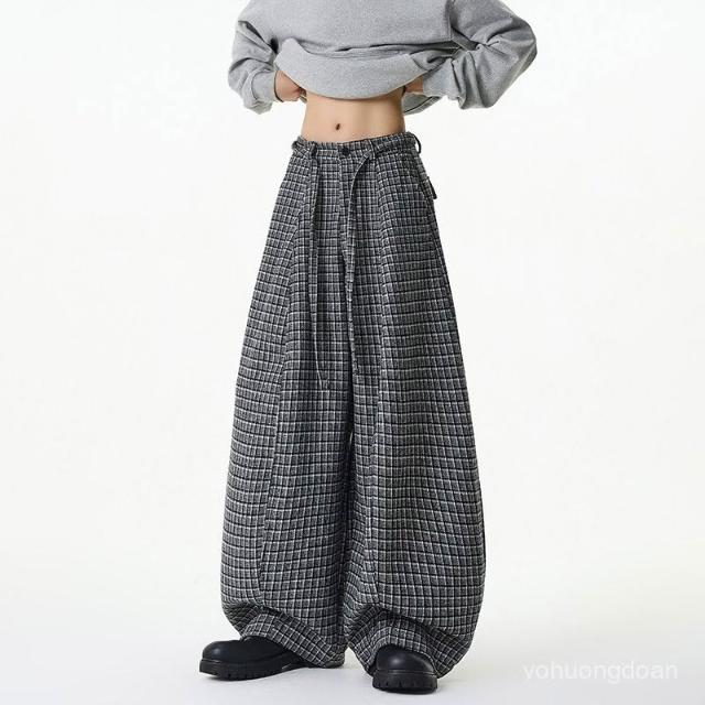 2025冬季美式壓褶抽繩格子設計闊腿休閒褲