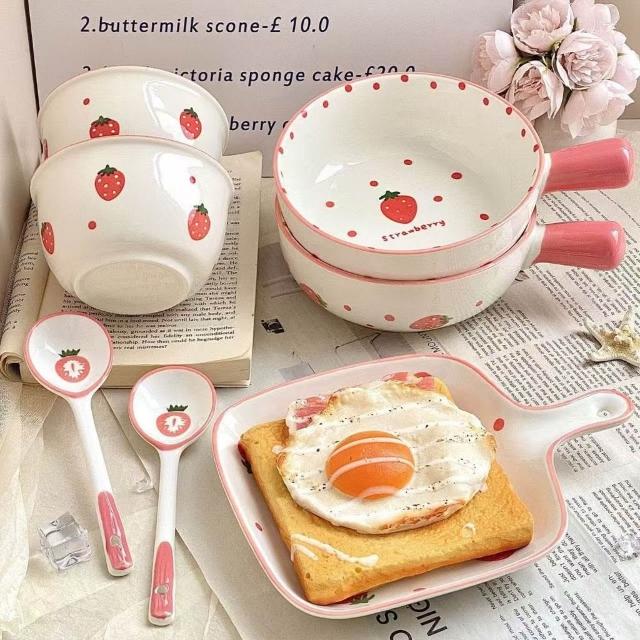 可愛 卡通 水果 草莓 粉草莓 陶瓷 餐具 米飯碗 佳樂碗 湯匙 長柄湯匙 圓勺 陶瓷餐具 家用 飯碗 釉下彩