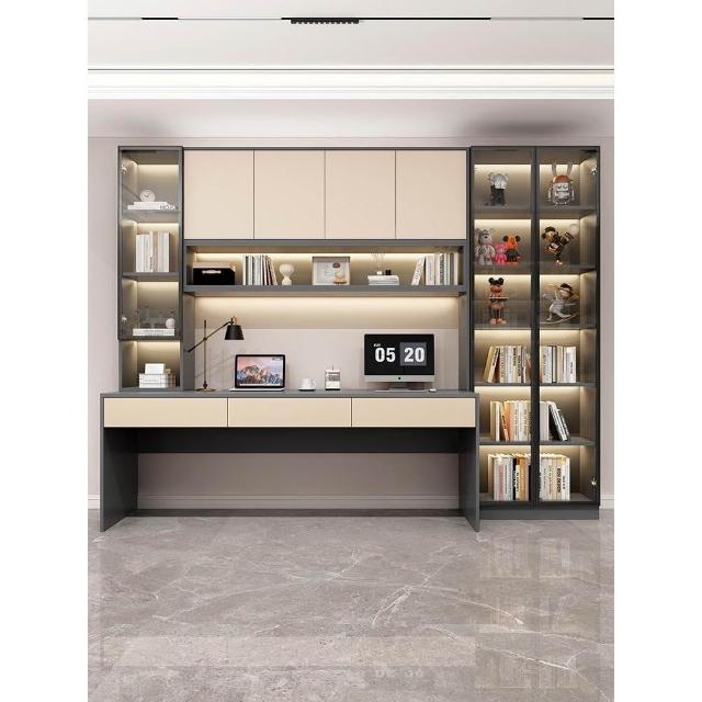 雙人書桌書櫃一體整牆實木電腦桌書架輕奢帶玻璃門學生臥室學習桌