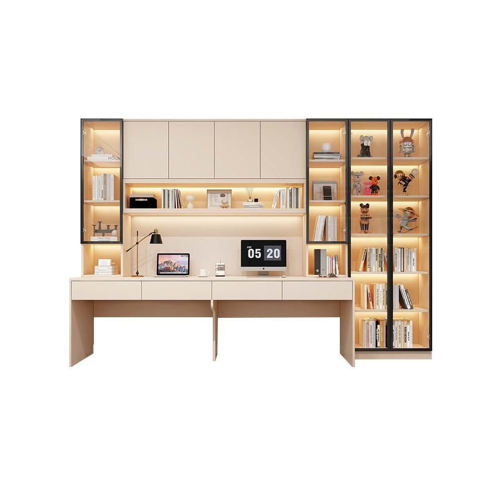 雙人書桌書櫃一體整牆實木電腦桌書架輕奢帶玻璃門學生臥室學習桌