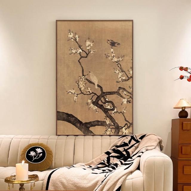 客廳沙發背景墻裝飾畫杏花雙雉圖豎版中古風掛畫法式小眾復古壁畫