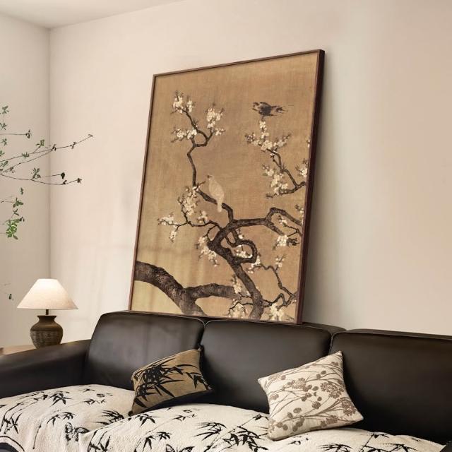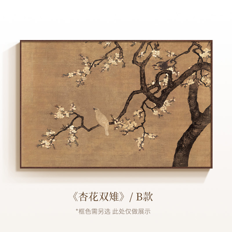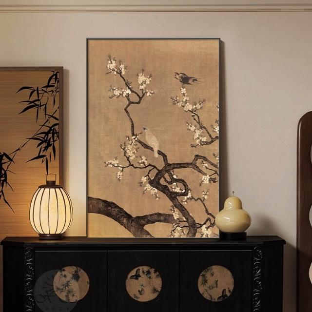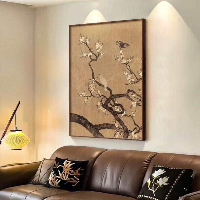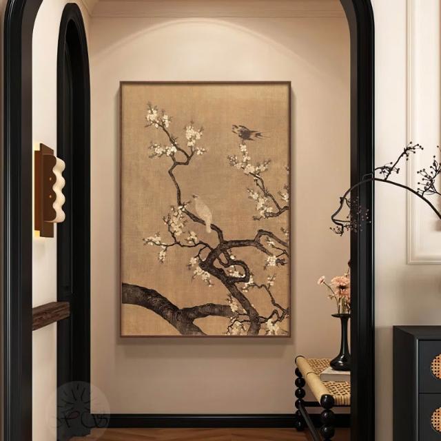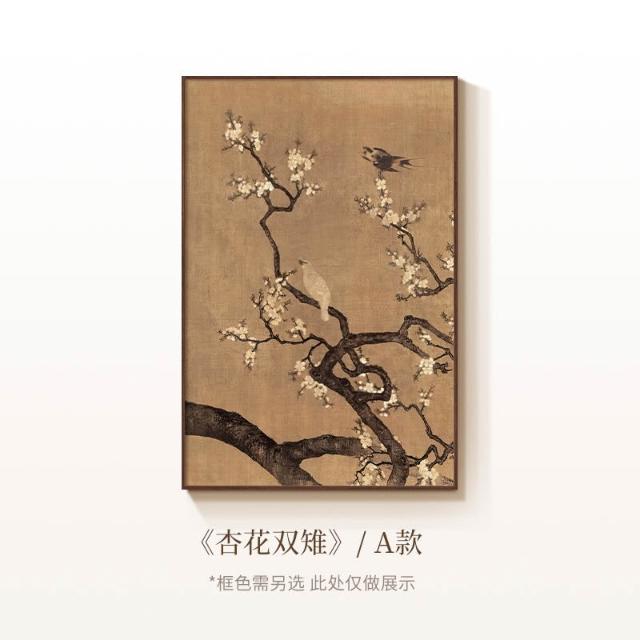 客廳沙發背景墻裝飾畫杏花雙雉圖豎版中古風掛畫法式小眾復古壁畫