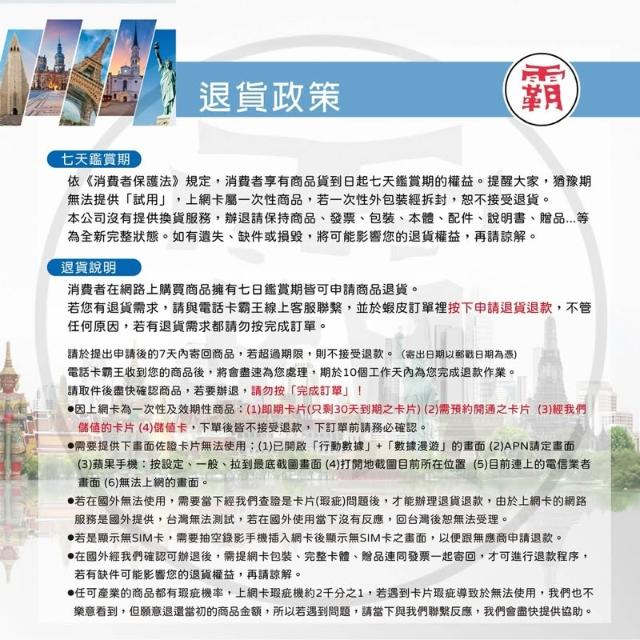 - 七天鑑賞期 依《消費者保護法》規定,消費者享有商品貨到日起七天鑑賞期的權益。提醒大家,猶豫期無法提供「試用」,上網卡屬一次性商品,若一次性外包裝經拆封,恕不接受退貨。 本公司沒有提供換貨服務,辦退請保持商品、發票、包裝、本體、配件、說明書、贈品...等為全新完整狀態。如有遺失、缺件或損毀,將可能影響您的退貨權益,再請諒解。 退貨說明 消費者在網路上購買商品擁有七日鑑賞期皆可申請商品退貨。 若您有退貨需求,請與@794armts線上客服聯繫,並於蝦皮訂單裡按下申請退貨退款,不管任何原因,若有退貨需求都請勿按完成訂單。 請於提出申請後的7天內寄回商品,若超過期限,則不接受退款。收到您的商品後,將會盡速為您處理,期於10個工作天內為您完成退款作業。請取件後盡快確認商品! •因上網卡為一次性及效期性商品:(1)即期卡片(只剩30天到期之卡片)(2)需預約開通之卡片(3)經我們儲值的卡片(4)儲值卡,下單後皆不接受退款,下訂單前請務必確認。 •需要提供下畫面佐證卡片無法使用:(1)已開啟「行動數據」+「數據漫遊」的畫面(2)APN畫面 無法使用聯繫LINE:@794armts 線上客服
