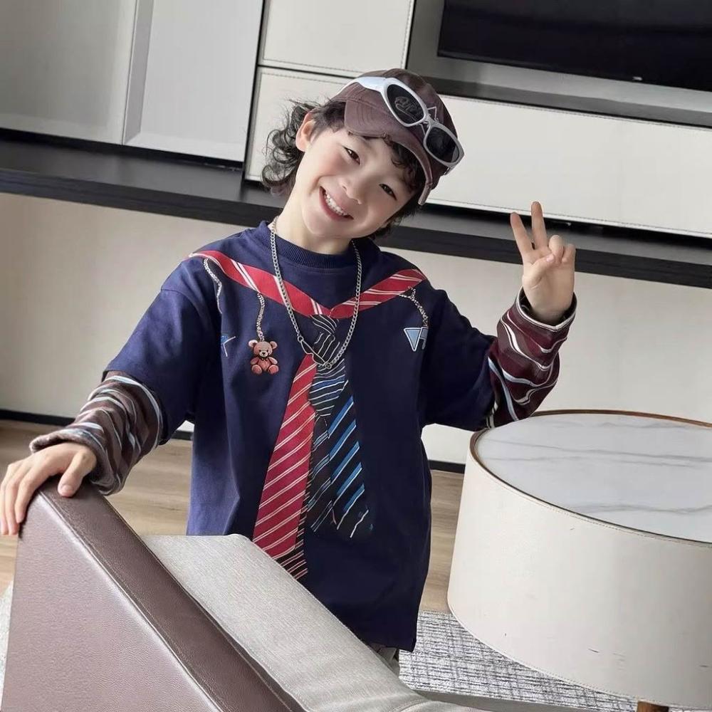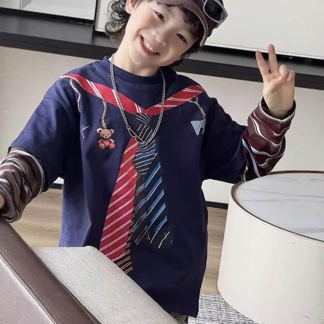 茂源優選男童痞帥風假兩件長袖T恤春季兒童印花拼接寬鬆潮酷上衣春秋裝潮
