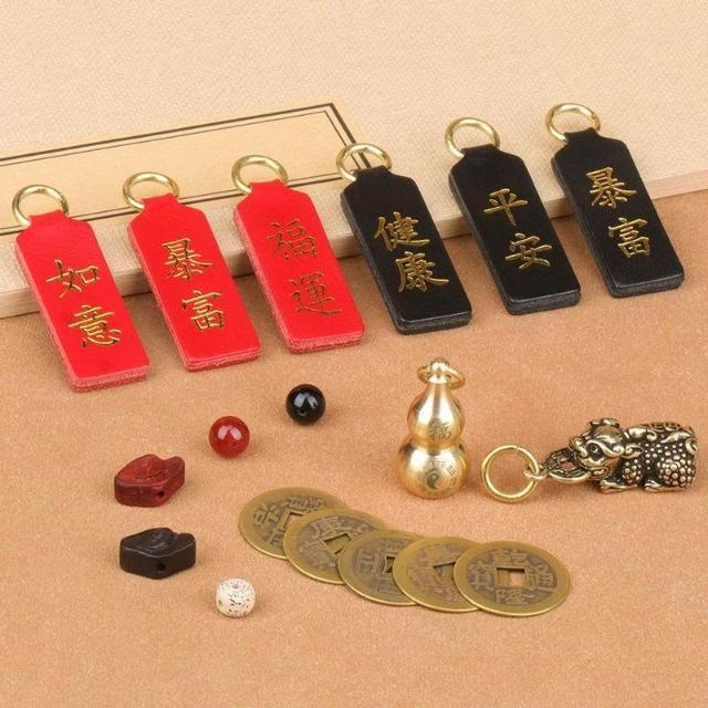 優先購硃砂真皮平安牌鑰匙扣汽車掛件黃銅葫蘆貔貅五帝錢編織繩掛鏈飾品