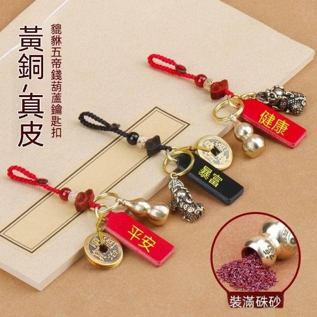優先購硃砂真皮平安牌鑰匙扣汽車掛件黃銅葫蘆貔貅五帝錢編織繩掛鏈飾品