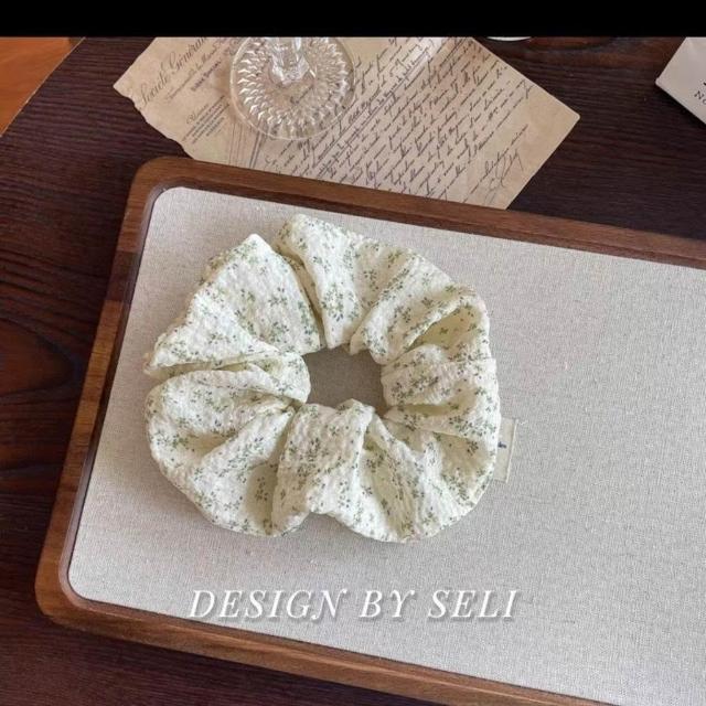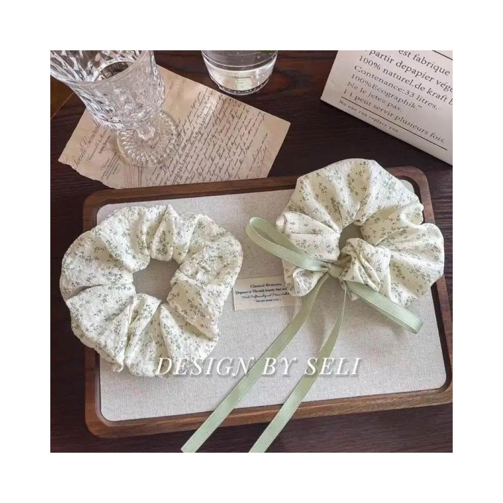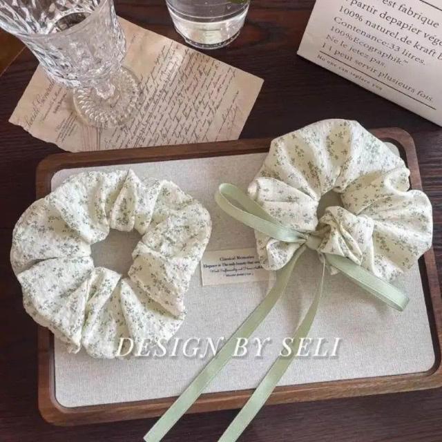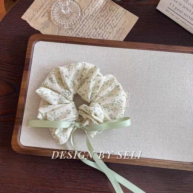 優選精品新款春夏豆沙綠色清新碎花大腸髮圈純棉蝴蝶結織帶少女發繩頭飾女