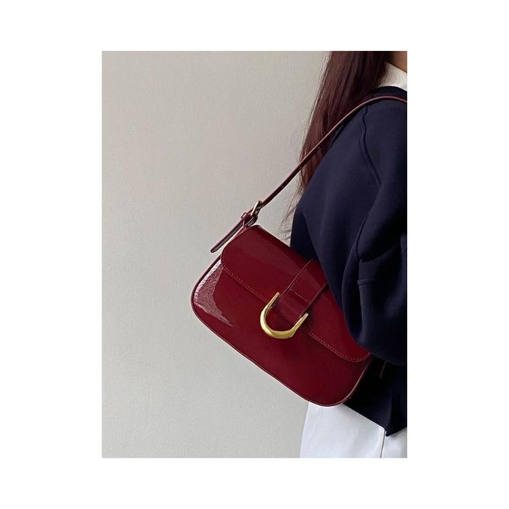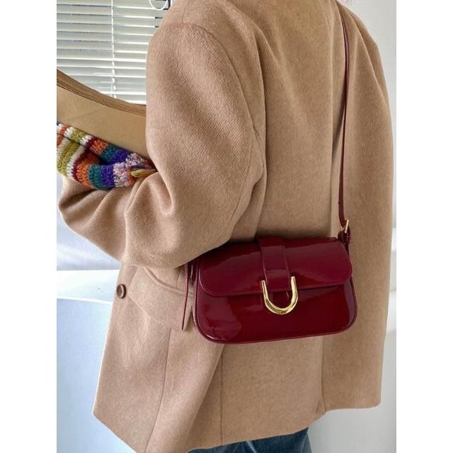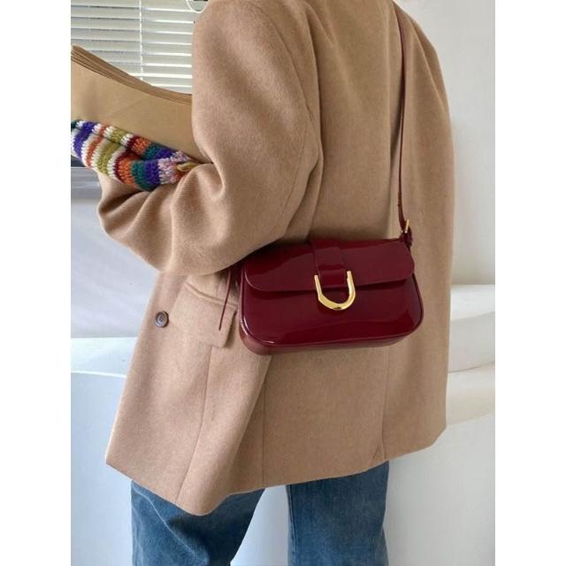 優選精品韓版復古酒紅色馬蹄扣手提腋下包單肩斜挎包女
