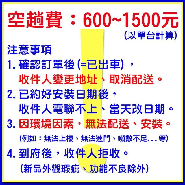 - 針對大型商品(包括:大型家電、家具床墊、健身按摩器材、車類...等),商店將於完成收款確認後,一天內〈不含例假日〉將會有專人與您確認相關配送細節等的聯繫。偏遠地區、樓層費及其它加價費用,皆由商店於約定配送時一併告知,商店將保留出貨與否的權利。